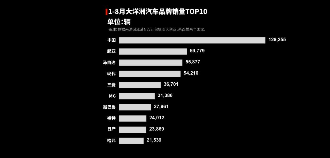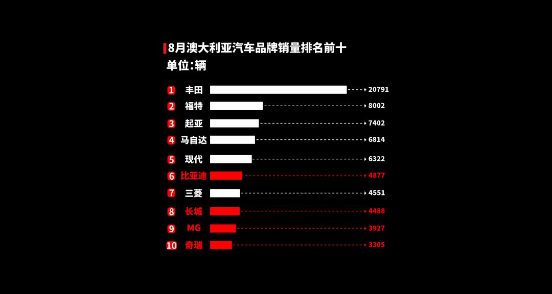 但最近几个月,澳洲新能源车的销量也在快速增长。根据澳大利亚汽车工业联合会(FCAI)的数据,8月,比亚迪在当地的单月销量已经超过了特斯拉。而且在8月,已经有4个中国品牌进入了当月销量Top10。