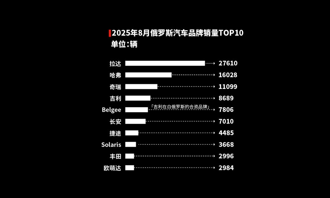 在这里,中国汽车品牌的渗透率超过60%。而在当地的销量Top10中,除了俄罗斯本土品牌拉达、起亚的Solaris和丰田之外,其余全部都是中国品牌。就连去年刚上市的中国的小米汽车,都已经出口到了这里。
