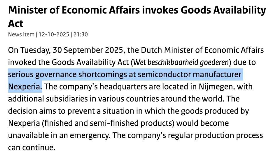 荷兰政府在官网上披露,此次行政指令是依据《物资供应法》下达,核心原因是认为安世半导体存在严重的治理缺陷。发出这一指令是为了防止安世半导体在全球范围内的货物在紧急情况下出现断供。现在公司依旧可以保持继续生产。