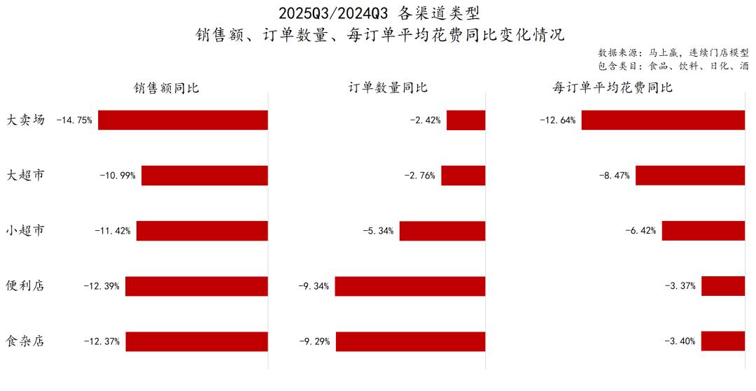 从整体表现来看,2025Q3各业态销售额同比均较去年同期下滑,其中大卖场降幅最大(–14.75%),大超市、小超市、便利店及食杂店也录得约10%左右的回落。对比结构可见,大业态(大卖场、大超市)的下滑主要来自客单价下降,消费者单次支出收紧;而小业态(小超市、便利店、食杂店)的下滑则更多源于订单减少,近场消费的热度或仍在下行通道当中。