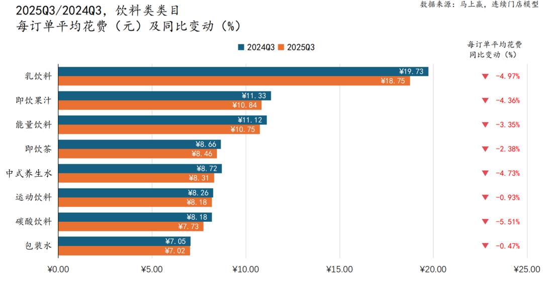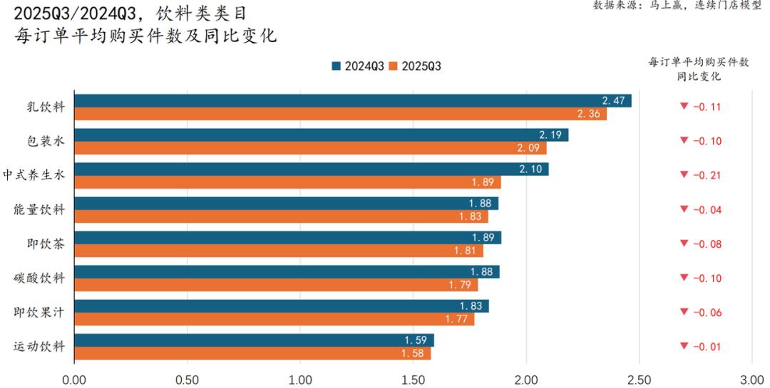 从整体来看,2025Q3饮料类目各细分品类的每订单平均购买件数均较去年同期下降,其中中式养生水下降最为明显,达到-0.21pcs/每订单平均。