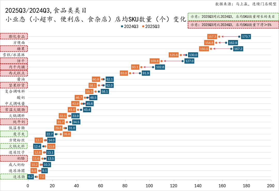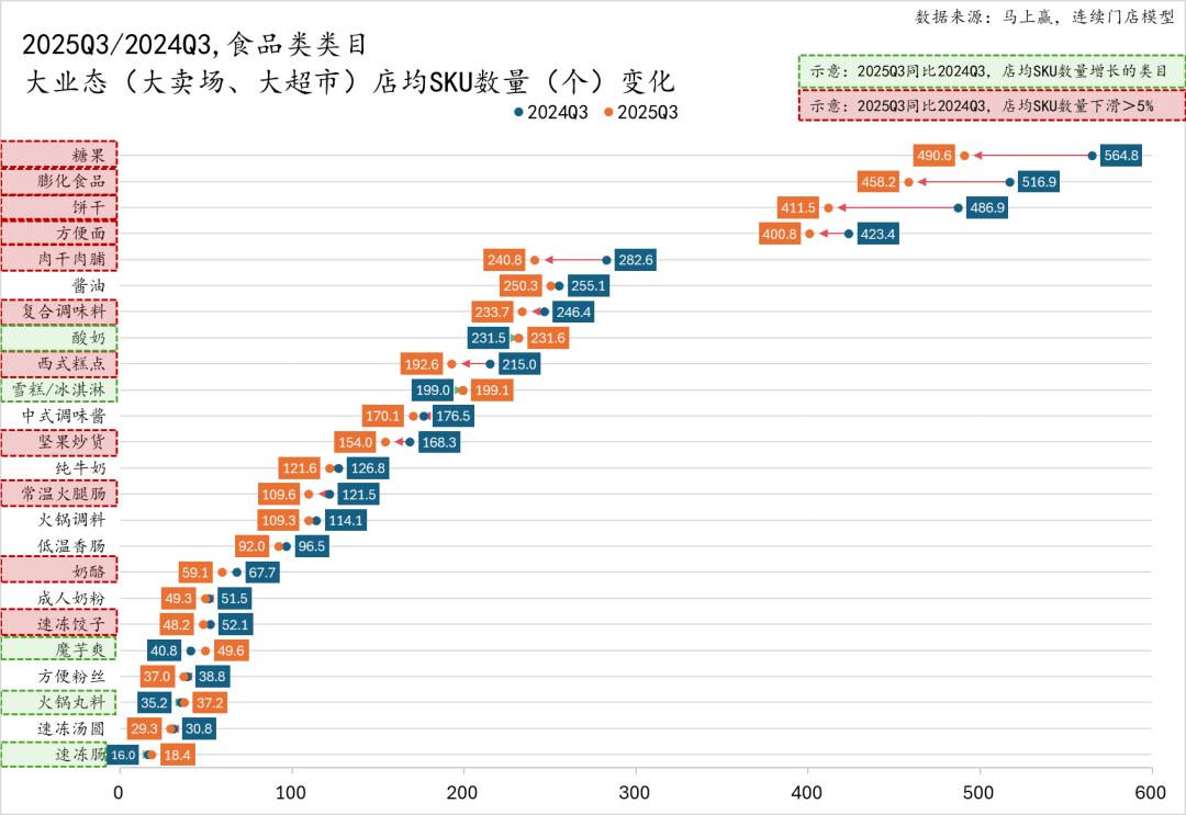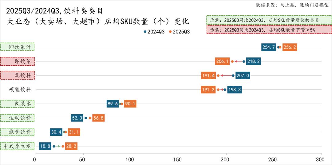 在下面的组图中,类目文字上有绿色虚线方框意为该类目在该业态类型中的店均SKU数量同比有所增长,没有背景色块的、红色虚线方框的类目则是店均SKU数量同比有所减少,其中红色虚线方框为2025Q3同比2024Q3,店均SKU数量同比下降超过5%的类目,敬请知悉。