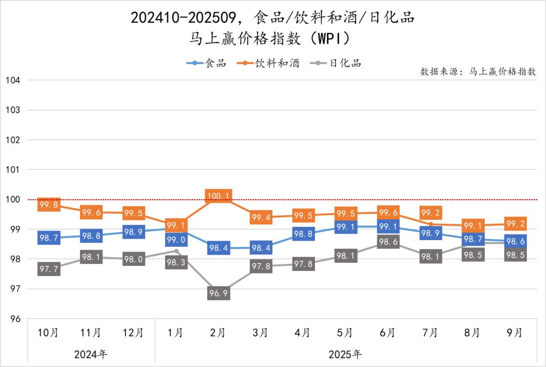 从趋势上看,进入Q3以来,三者走势呈现较大的差异——饮料在5–6月达到阶段高点(99.5–99.6)后,随着夏季旺季的竞争加剧在7–9月略有回落,或可提示今年的竞争依然以“以价换量”与“性价比”策略为核心;食品价格亦从99.1下滑至98.6,趋势上依然呈现一定程度的下行;相比来说,日化品则呈现出一定的回升。