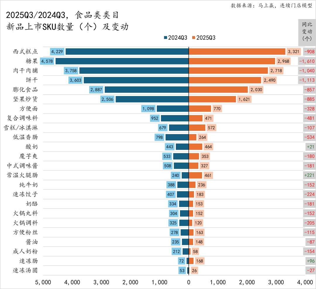 从上市新品数量看,2025年Q3整体新品上市数量规模较大的仍是西式糕点、糖果、肉干肉脯、饼干、膨化食品、坚果炒货等休闲零食类目,但这些类目的上新数量同比均呈现明显下滑,其中糖果、肉干肉脯、饼干类目的新品上市数量同比缩减了超过千款,或可说明几个类目中品牌的态度,也可能是几个类目中的品牌正在从传统线下零售上新,转变为渠道特供、渠道联名,或将销售形式从传统的件售转变为散称、量贩,新品数量的减少,或也将推动类目的集中度进一步提升。