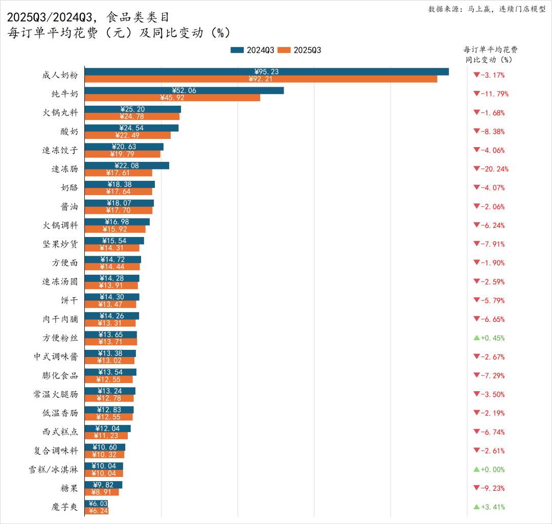 从整体来看,2025年Q3食品类目中,不同子类目的每订单平均花费差异显著,其中成人奶粉、纯牛奶、酸奶、奶酪等乳制品整体依然位居前列,显示其相对高客单价的特性。但与此同时,这些高价类目的同比降幅也较为明显,尤其是纯牛奶类目,其每订单平均花费同比下降接近12%,或许也是上文中提到的占比、类目销售额同比下降的重要构成因素之一。