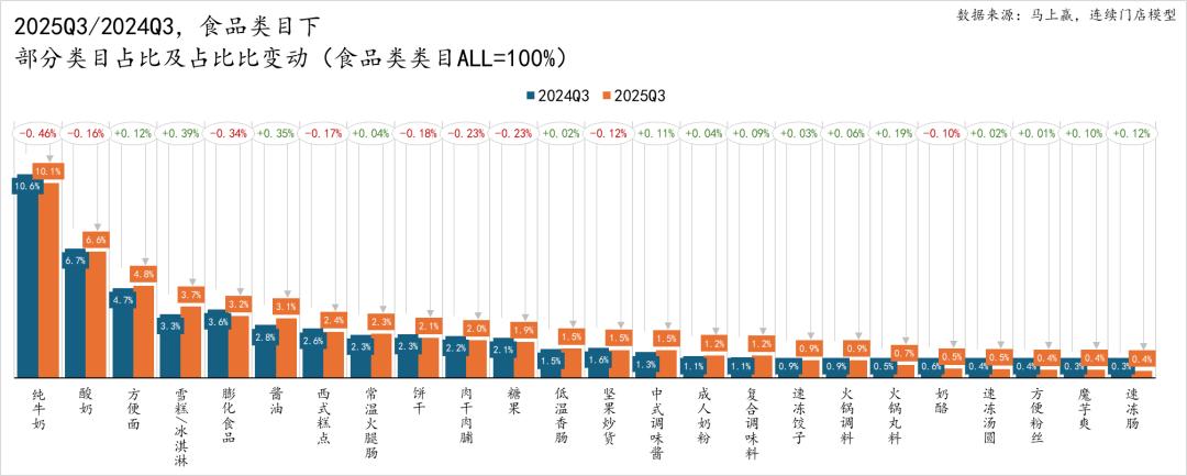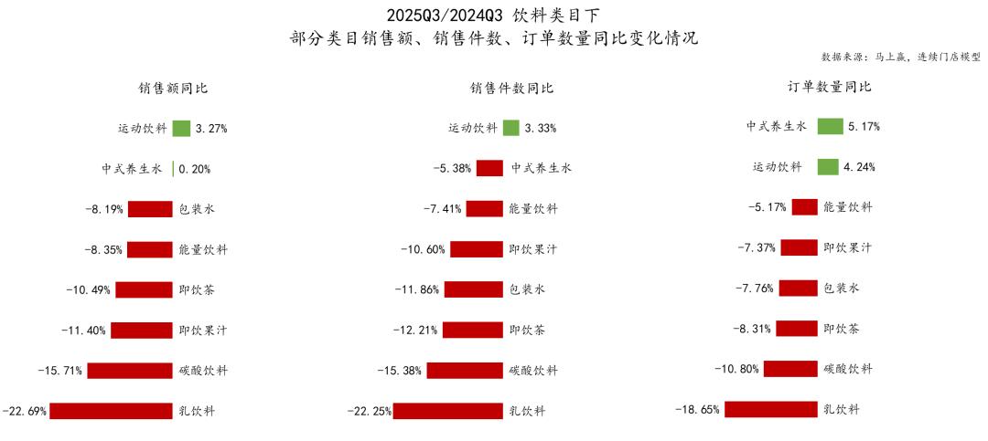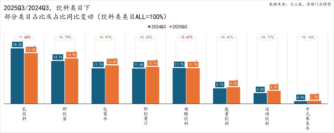 2025Q3的饮料类目中,乳饮料呈现明显的占比同比下滑,碳酸饮料小幅下滑,其余类目则均呈现占比同比上涨。