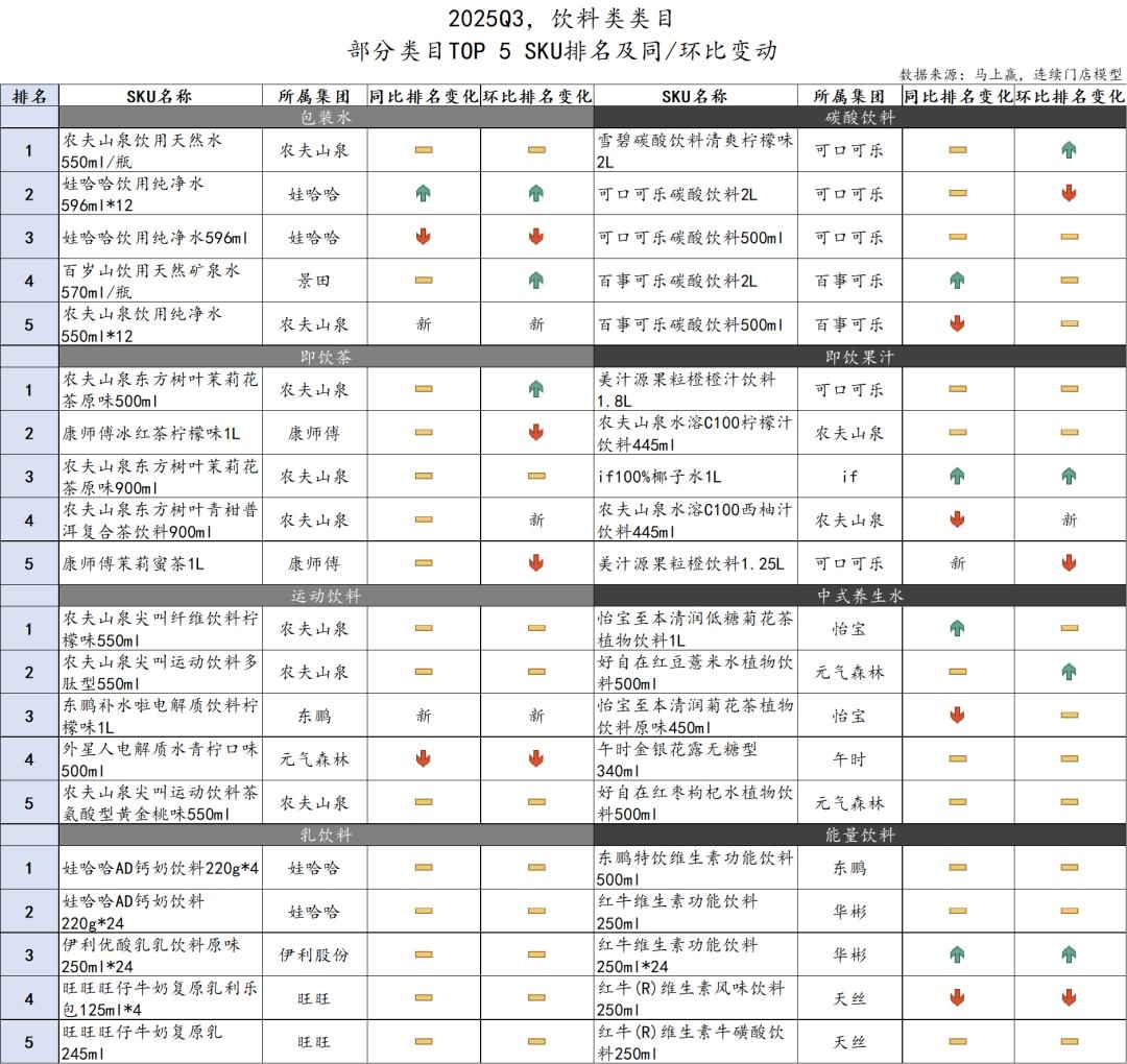 2025年Q3饮料类整体变动相对温和,榜单中产品的更替频率明显低于食品类,显示饮料市场的头部格局更稳定、竞争节奏更平缓。主力品牌如农夫山泉、可口可乐、怡宝、娃哈哈等依然牢牢占据品类核心席位,头部SKU延续高认知、高铺市的优势,市场仍以品牌力和渠道覆盖取胜。总体来看,饮料类在本季度的结构相对稳健,主流品类延续强势,新兴品牌和功能性产品则成为推动细分增长的新力量。
