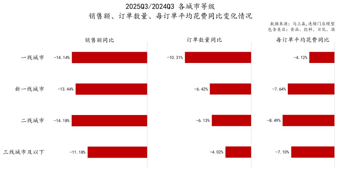 马上赢品牌CT的线下零售监测网络覆盖了全国县级以上各等级城市(不含乡、镇、村),并深度覆盖全国核心城市群。我们拉取了各城市等级的2025Q3相关数据,并进行同比情况的观察。