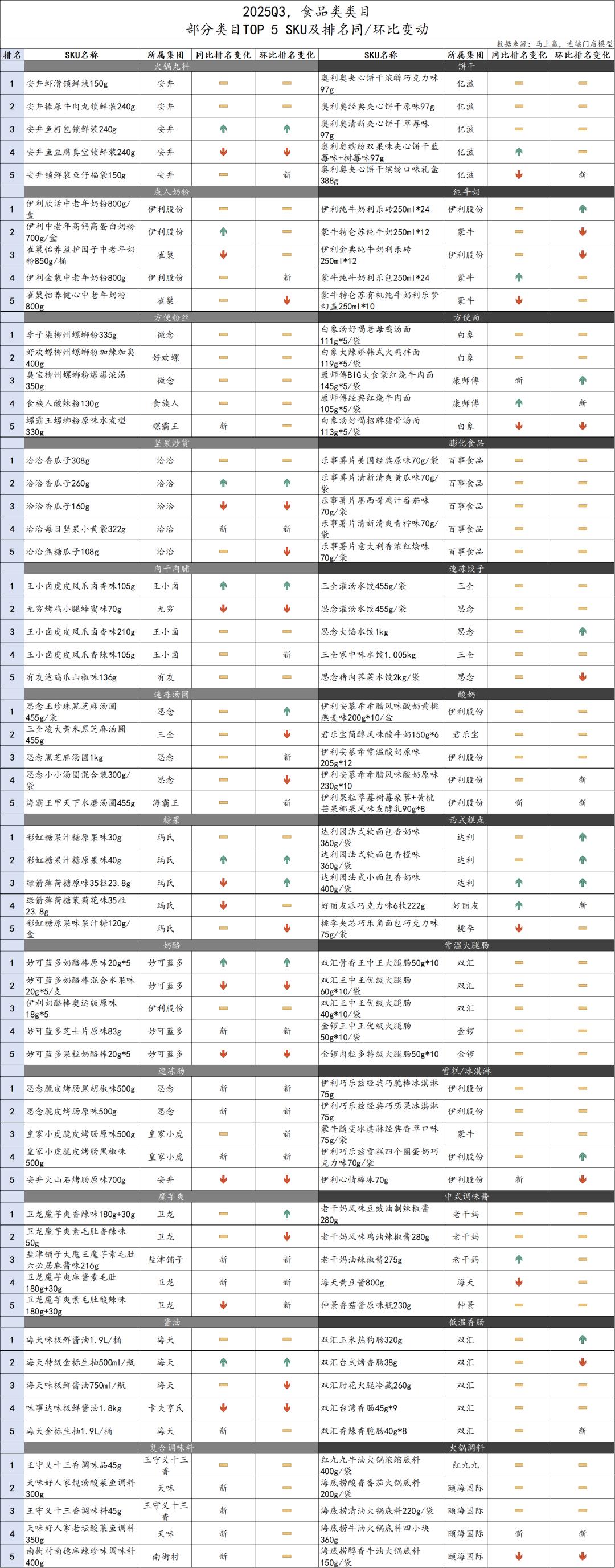 在以商品为核心的「货」相关的观察中,基于上述食品、饮料中的典型类目范围,我们拉取了这些类目在该季度的市场份额Top 5 SKU及与去年相比的排名变动情况,以及这些类目的新品上市数量变化。