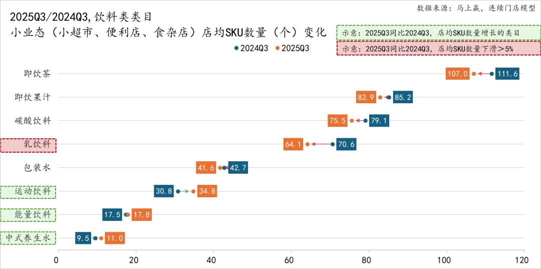 2025Q3,饮料类类目,小业态中,店均SKU数量下降的类目更多,同比上升的仅有运动饮料、能量饮料与中式养生水。乳饮料呈现较明显的下滑,即饮茶、即饮果汁、碳酸饮料的店均SKU数量则是小幅下滑。