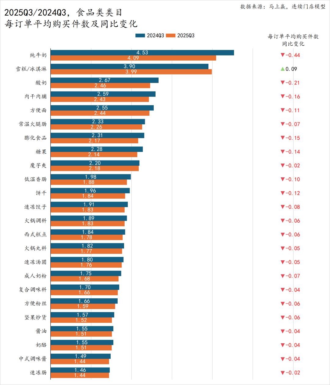 从整体来看,2025年Q3食品类目中,除了雪糕/冰淇淋,其他所有子类目的每订单平均购买件数均同比下降,显示消费者整体进入更为理性的购买阶段,囤货性购买与单次购买量或正在进一步减少。