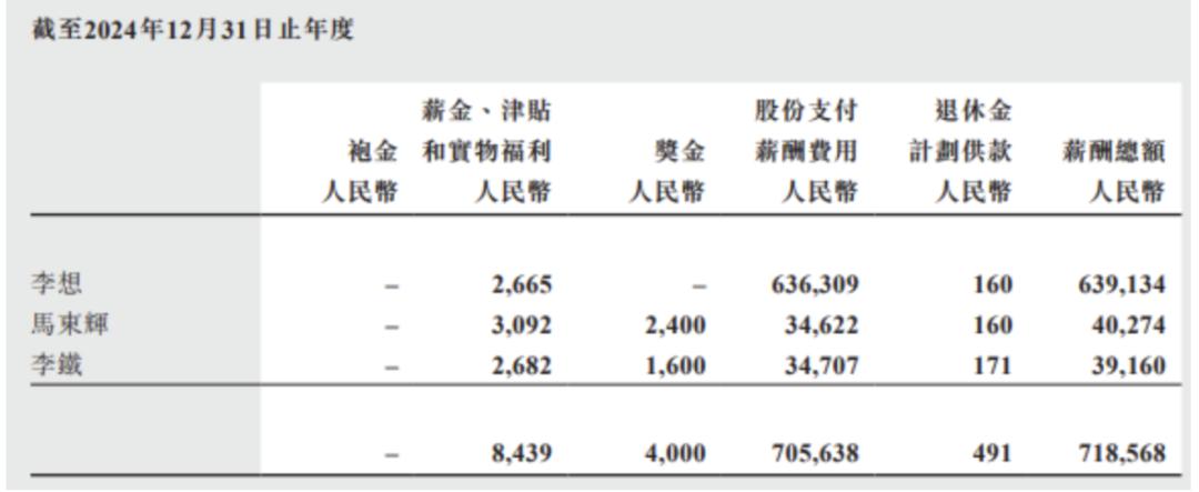 不过,根据理想汽车2024年年报,李想2024年的实际薪酬构成为:266.5万元的薪金、津贴和实物福利,16万元的退休金计划供款,以及6.36亿元的股份支付薪酬费用,合计6.39亿元。