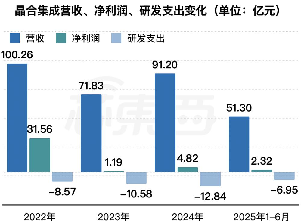 2022年、2023年、2024年、2025年1-6月,晶合集成收入分别为100.26亿元、71.83亿元、91.20亿元、51.30亿元,净利润分别为31.56亿元、1.19亿元、4.82亿元、2.32亿元,研发费用分别为8.57亿元、10.58亿元、12.84亿元、6.95亿元,毛利率分别为43.1%、20.3%、25.2%、24.6%。