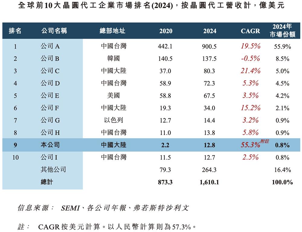 根据弗若斯特沙利文的资料,2024年,以营收计,晶合集成是全球第九大、中国大陆第三大晶圆代工企业,以及全球最大的DDIC晶圆代工企业、全球第五大CIS晶圆代工企业。