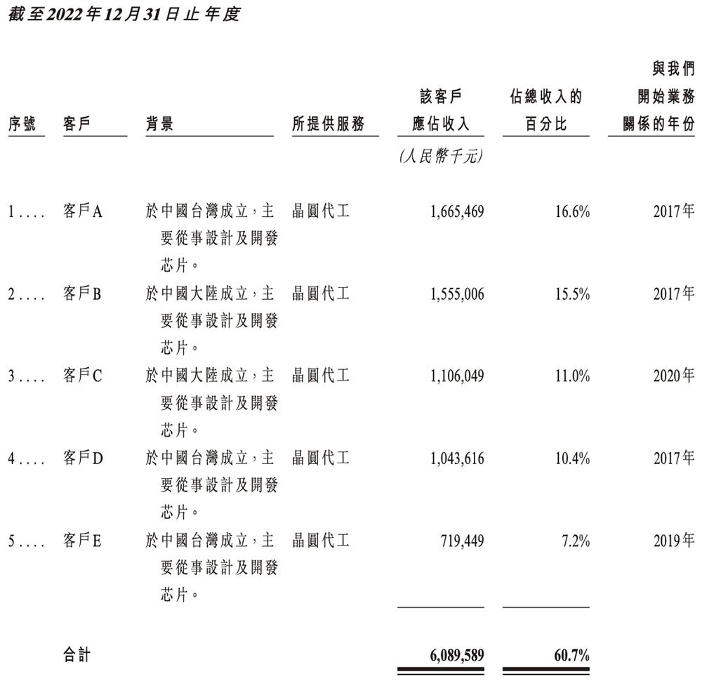 五大客户的收入分别占其各年度/期间总收入的60.7%、64.2%、62.2%、58.1%。