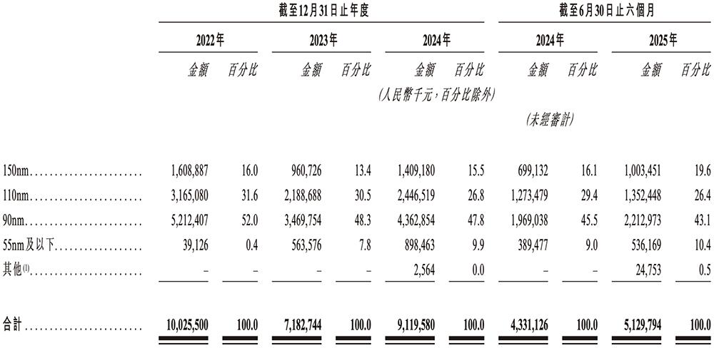 按技术节点划分,90nm是其主要收入来源,但收入占比近三年逐年下滑。