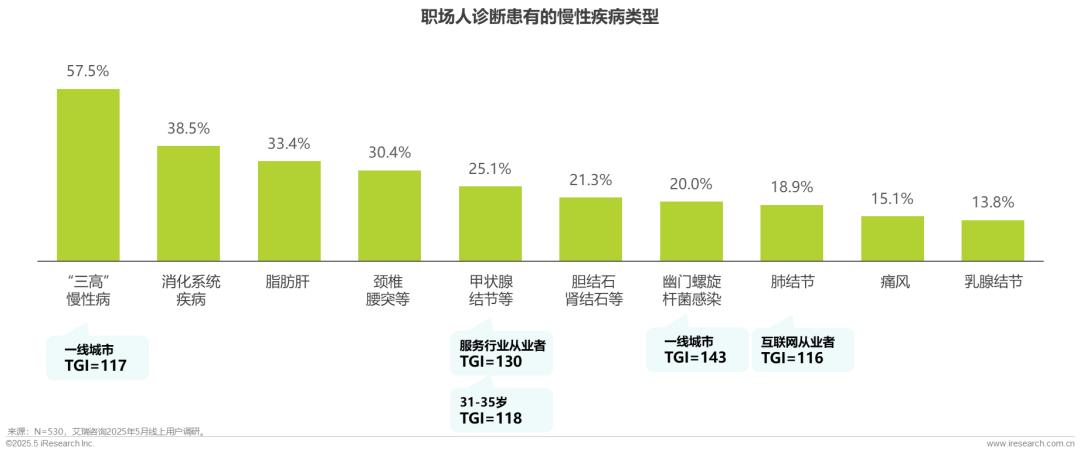 “三高”、消化系统疾病、脂肪肝、颈椎病、腰椎间盘突出及甲状腺结节等,是当前职场人群高发的慢性病类型。