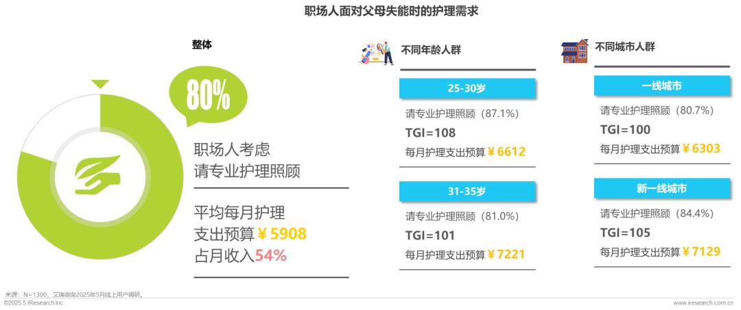 父母失能,请专业护理成主流选择,25-30岁职场人意愿近90%,预算6600元+;31-35岁职场人意愿超80%,月均预算达7221元,居各人群之首;细分城市来看,新一线及一线高线城市职场人意愿更高,是主要目标人群。