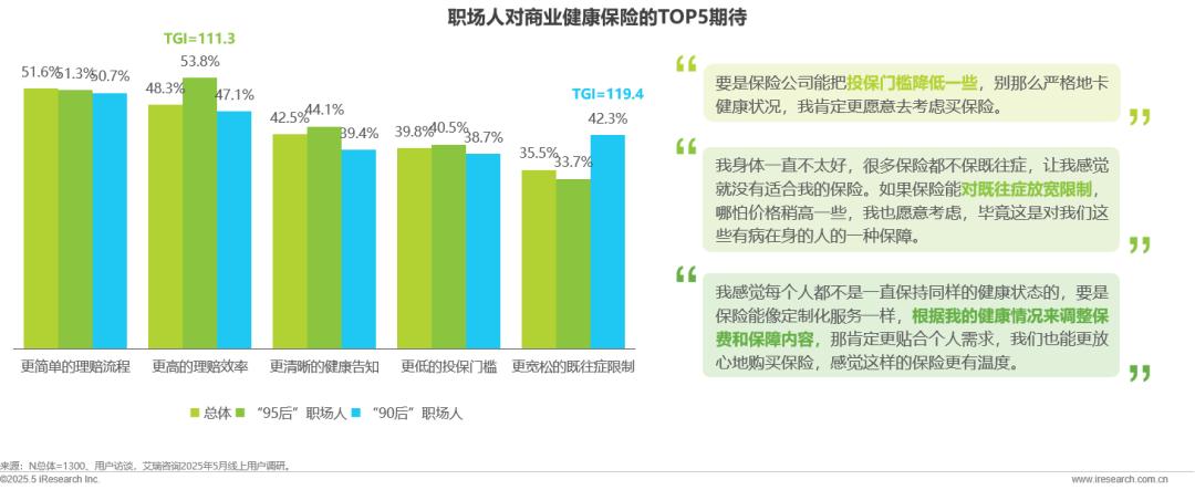 职场人对保险的核心诉求聚焦理赔简单高效、降门槛、松限制,其中“90后”职场人期待放宽既往症限制的达42.3%,远高于总体。此外,职场人期望产品能依据个人健康灵活调整保费与条款,实现个性化服务,以精准契合多元的健康需求。