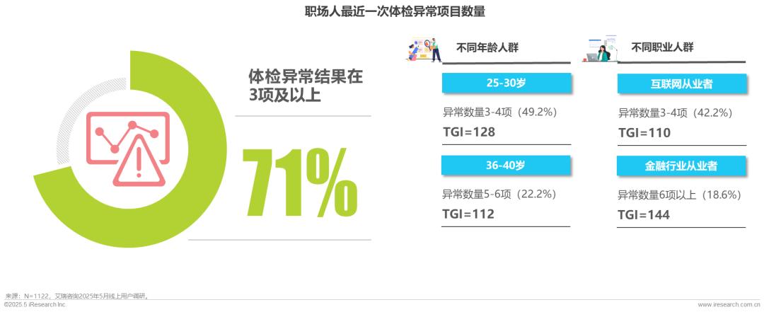 25-30岁人群的体检异常项多集中在3-4项,而36-40岁人群则更多人达到5-6项;从职业分布看,互联网从业者体检异常项多在3-4项,而金融行业从业者体检异常超过6项的占比更多。
