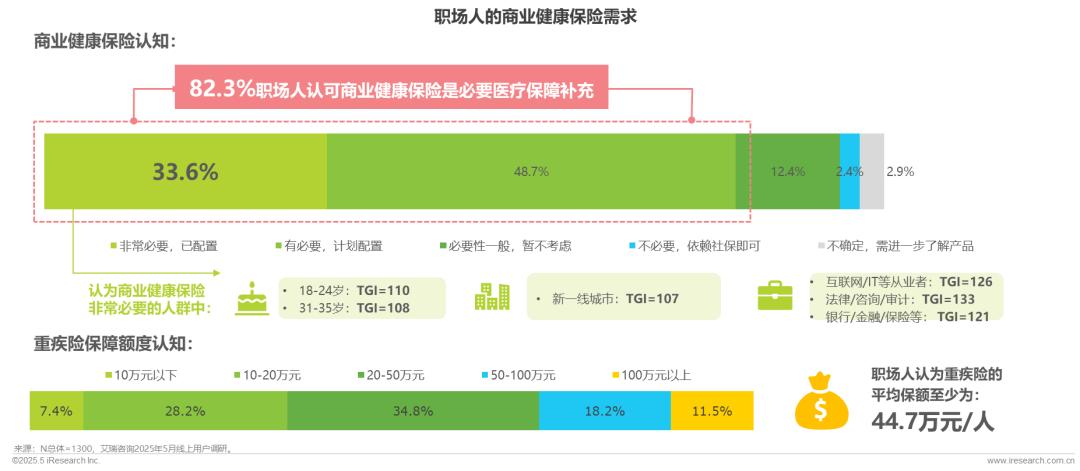 82.3%职场人认可商业健康保险是必要医疗保障补充;但仅33.6%职场人实际已购买保险,年龄主要在18-24岁/31-35岁;新一线城市职场人居多;重疾险平均保额至少为44.7万元;从整体看,保险配置率与认知存在较大差距,“保障缺口”亟待填补。
