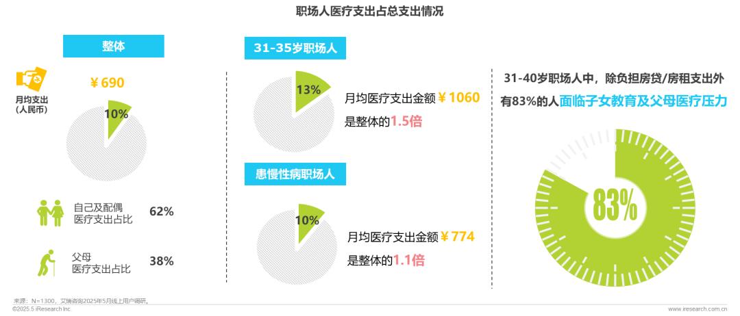31-35岁职场人,月均医疗支出金额是整体均值的1.5倍;患慢性疾病,诸如“三高”、结节等职场人群,其月均医疗支出金额是整体均值的1.1倍。