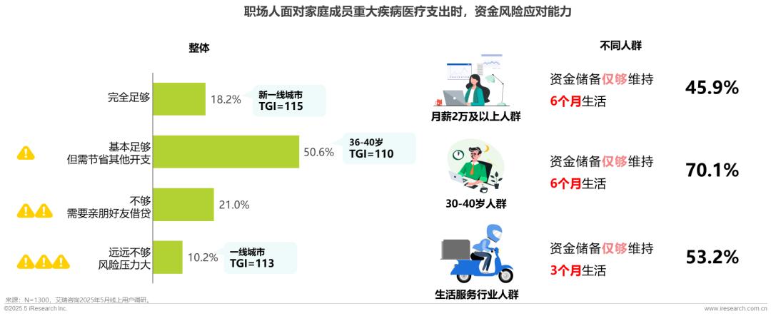 职场人医疗支出压力大,仅18.2%的人群表示面对家庭成员重大疾病医疗支出时,资金风险应对能力完全足够;70.1%的30-40岁职场人群,储备资金仅够支撑6个月生活;而生活服务行业人群,储备资金仅够支撑3个月生活。