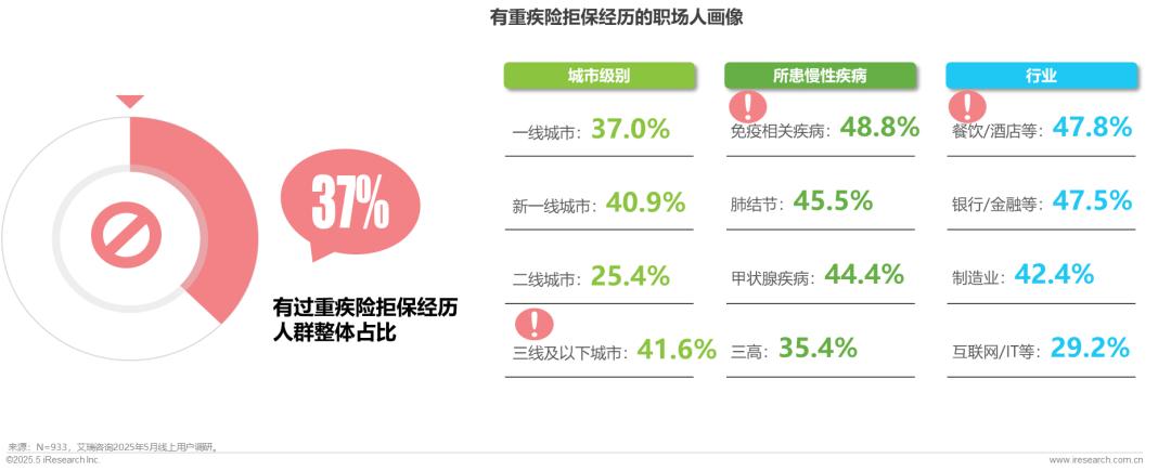 部分职场人购买时仍面临较大困境,整体重疾险拒保率超三成,患免疫疾病、肺结节、甲状腺疾病群体的拒保率突破四成,相关需求亟需差异化解决方案满足。