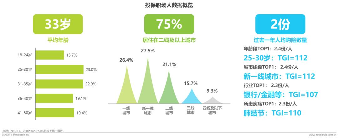 投保职场人平均年龄33岁,35岁及以下占比达61.5%,其中“90后”占比为45.9%成为主要年龄层;人均保单持有2份,投保人中在二线及以上城市居住的达四分之三,投保职场人呈现年轻化、高线城市化、购险普遍化趋势。