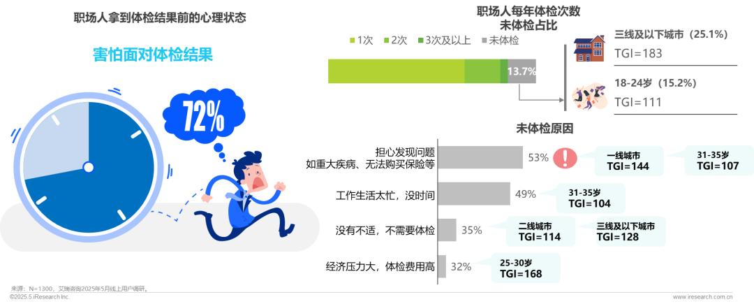 尤其来自一线城市、31-35岁用户,他们更担心无法购险而不敢体检;此外,每年仍有13.7%职场人不参加体检,他们主要来自三线及以下城市,以及18-24岁年轻群体;未参加体检原因主要是担心发现重大疾病问题,亦或因病未来无法购买保险等。