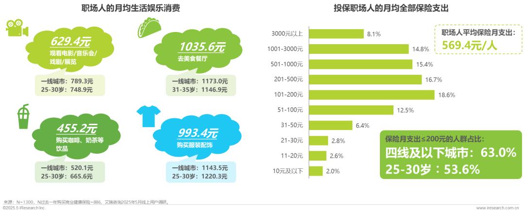 职场人消费重享受轻保障,咖啡自由背后投保行为不足。25-30岁职场人月均饮品支出665.6元,但保险支出不足200元的却高达53.6%,不同群体均呈现消费豪爽、投保谨慎的趋势。职场人消费失衡的特征反映出其风险防范意识的不足。