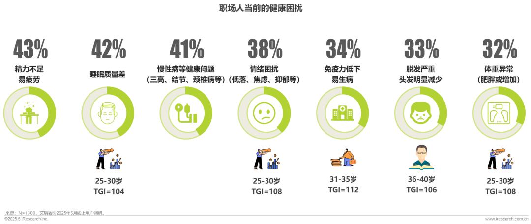 25-30岁职场人睡眠质量最差,同时容易受到情绪困扰,体重增加,易肥胖,低落、焦虑、抑郁等症状频发;31-35岁职场人免疫力相对较差,更容易生病;36-40岁职场人则头发明显减少,脱发人群增多。