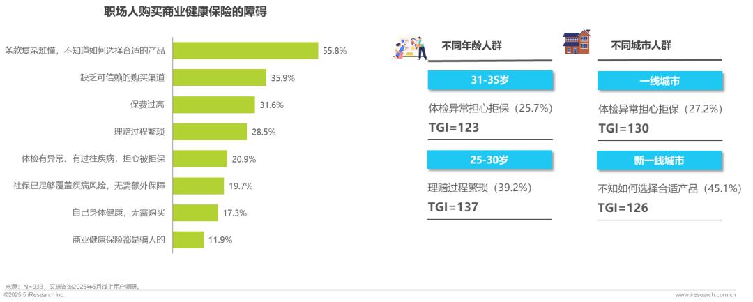 55.8%的职场人因条款复杂与产品选择迷茫而放弃投保;一线城市、31-35岁人群更担心体检异常无法购险;理赔过程繁多是阻碍25-30岁人群购买保险的主要障碍之一;而更多来自新一线城市人群不知道如何选择合适的保险产品而望而却步。