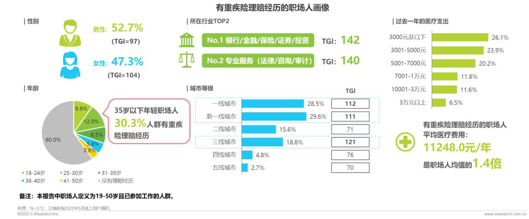 重疾并非老年风险,尤其针对职场人群(19-50岁且已参加工作的人群),具有重疾险理赔经历,35岁以下职场人占比超过三成;金融、审计等工作高强度行业理赔率显著偏高。有重疾险理赔经历职场人正面临健康与经济双重压力,在过去一年平均产生的医疗费用达11248.0元,需通过足额保险保障,将风险降至最低。