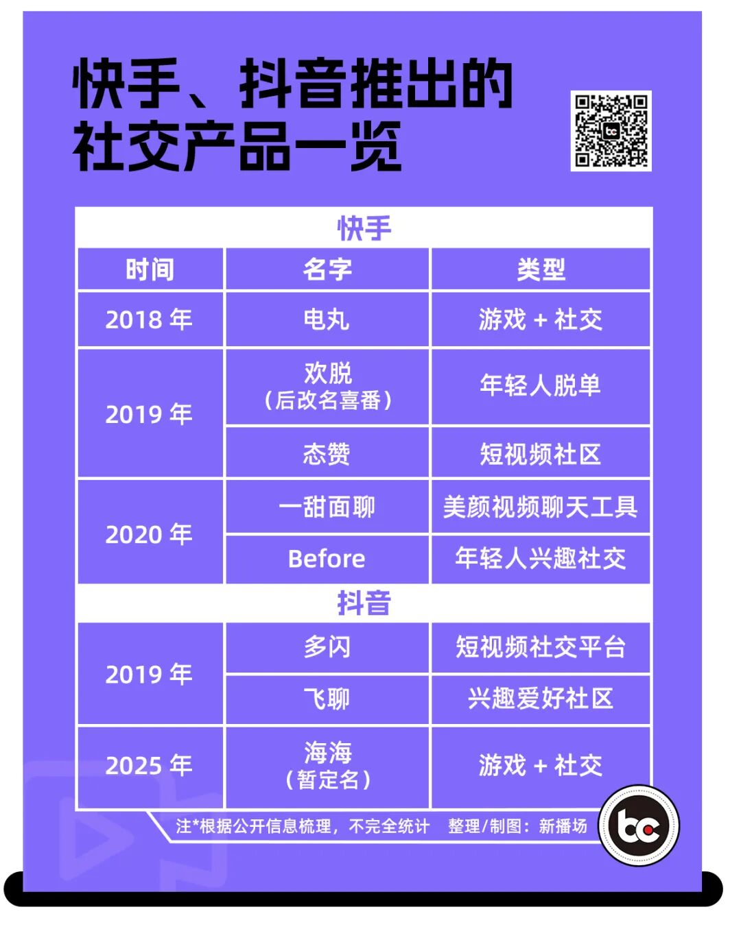 除了抖音之外,快手也曾上线过多款社交产品,如电丸、一甜面聊等,但并未激起太大的水花。