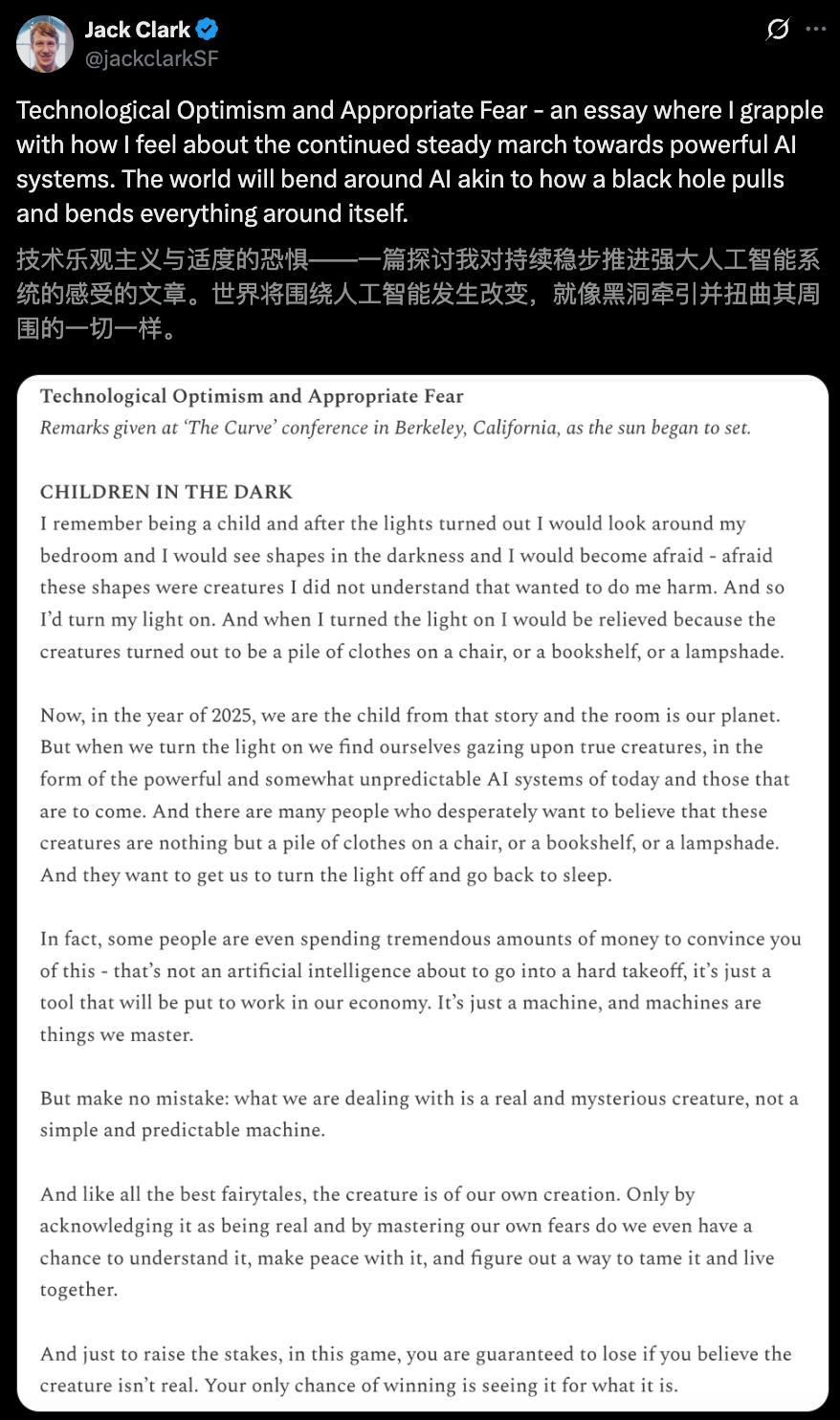 他将AI视为一种「神秘生物」,而非简单「机器」,每一句话都流露出对技术进展的乐观,以及随之而来的深切恐惧。