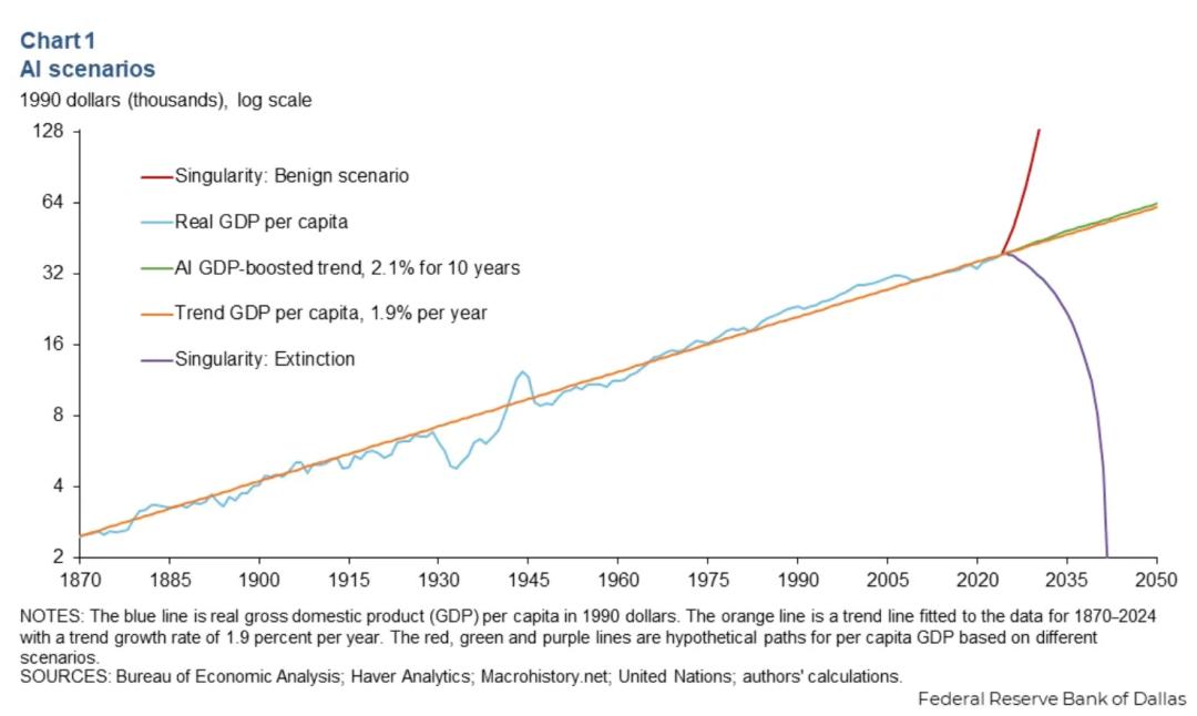 此前,达拉斯联储的报告,也从经济学角度印证了AI发展带来的极端可能性,即要么带来巨大的GDP增长,要么可能导致人类灭绝。