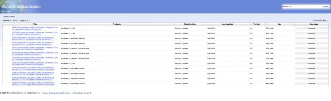 接着访问 Microsoft® Update Catalog,这是微软官方提供的离线安全更新下载网站。在网站的搜索框中直接输入当月的知识库文章编号,也就是以 KB 开头的编号。例如,如果你想下载 2024 年 9 月 9 日的离线安全更新包 KB5065429,只需在搜索结果中找到适用于 Windows 10 Version 21H2 的更新包。