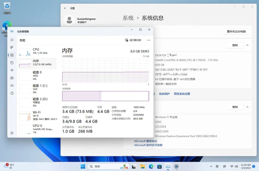 安装后的系统非常干净,仅仅保留了 Microsoft Store 以及微软账号服务等大多数人常用的核心组件。所以该系统的资源占用相当低,整体运行后的内存占用大约在 3GB 左右,即使是十年前的电脑硬件也能流畅运行。