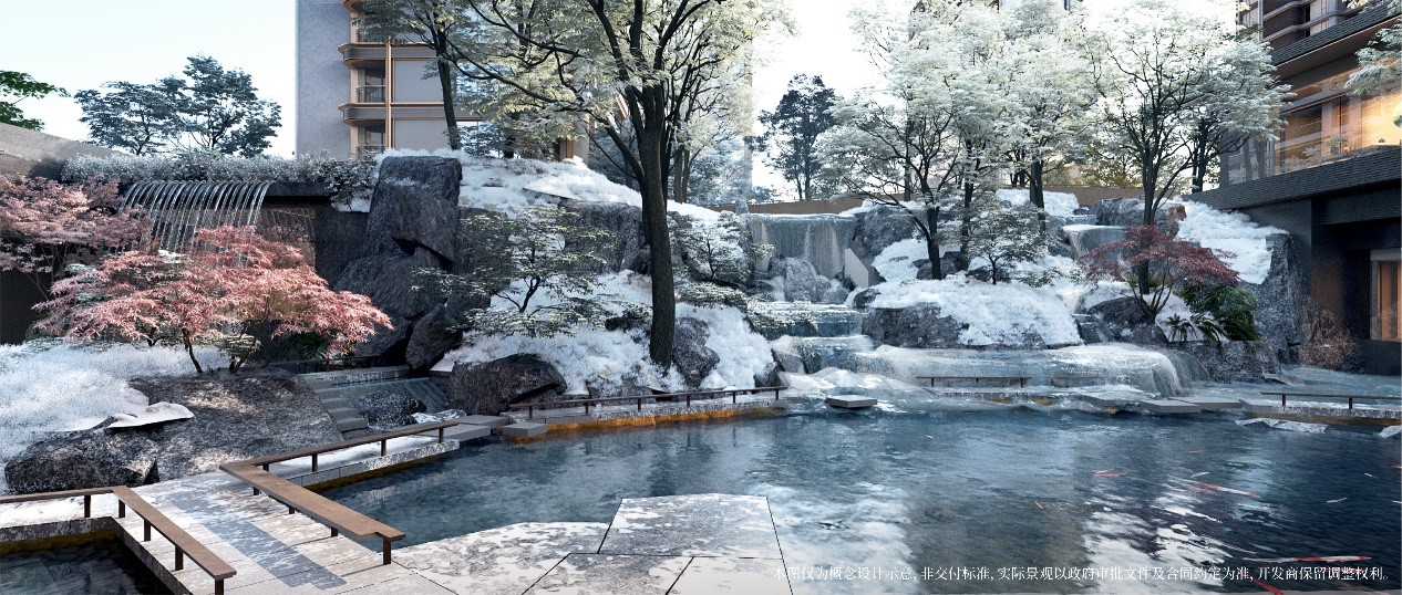 在整体规划的骨相上,项目延续中国传统山水格局,北倚山势,南临水域,形成山水环抱、负阴抱阳的格局。宅隐于园,三进宅第。园内构建约4.5万方宏阔又精微的山水体系;千瀑飞雪,约45米宽瀑布群;约3000㎡水域、约2000㎡水畔东坡、银杏山林、约120米樱花堤岸,共同构成可居可游的沉浸式园林体验。