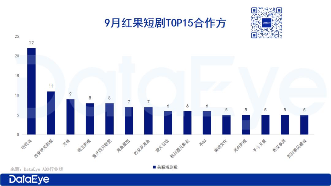 从合作方角度来看,9月红果短剧生态呈现头部集中化与策略差异化的双重格局。9月在榜短剧数最多的是听花岛,共有22部微短剧在榜;其次是西安秋元影视,共11部微短剧在榜;第三是西安秋元影视共9部短剧。