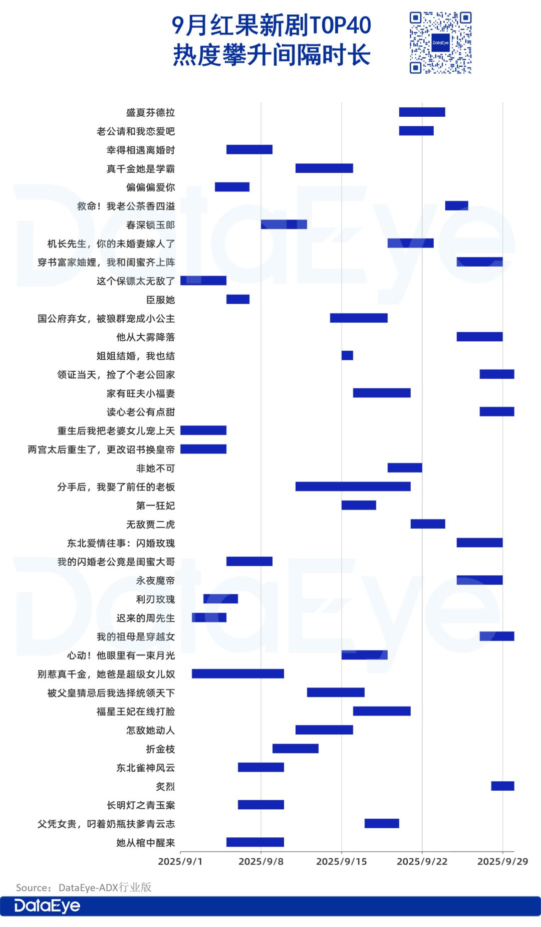 而红果新剧热度峰值TOP40的微短剧中,热度提升最慢的是《分手后,我娶了前任的老板》从上线到热度峰值共用了10天,热度值达6675万,本月上榜共13次。通过“口碑积累+逐步推流”的打法,也能够成功突围,说明微短剧并非只有“上线即爆”,渐进发酵式选手仍有生存空间。