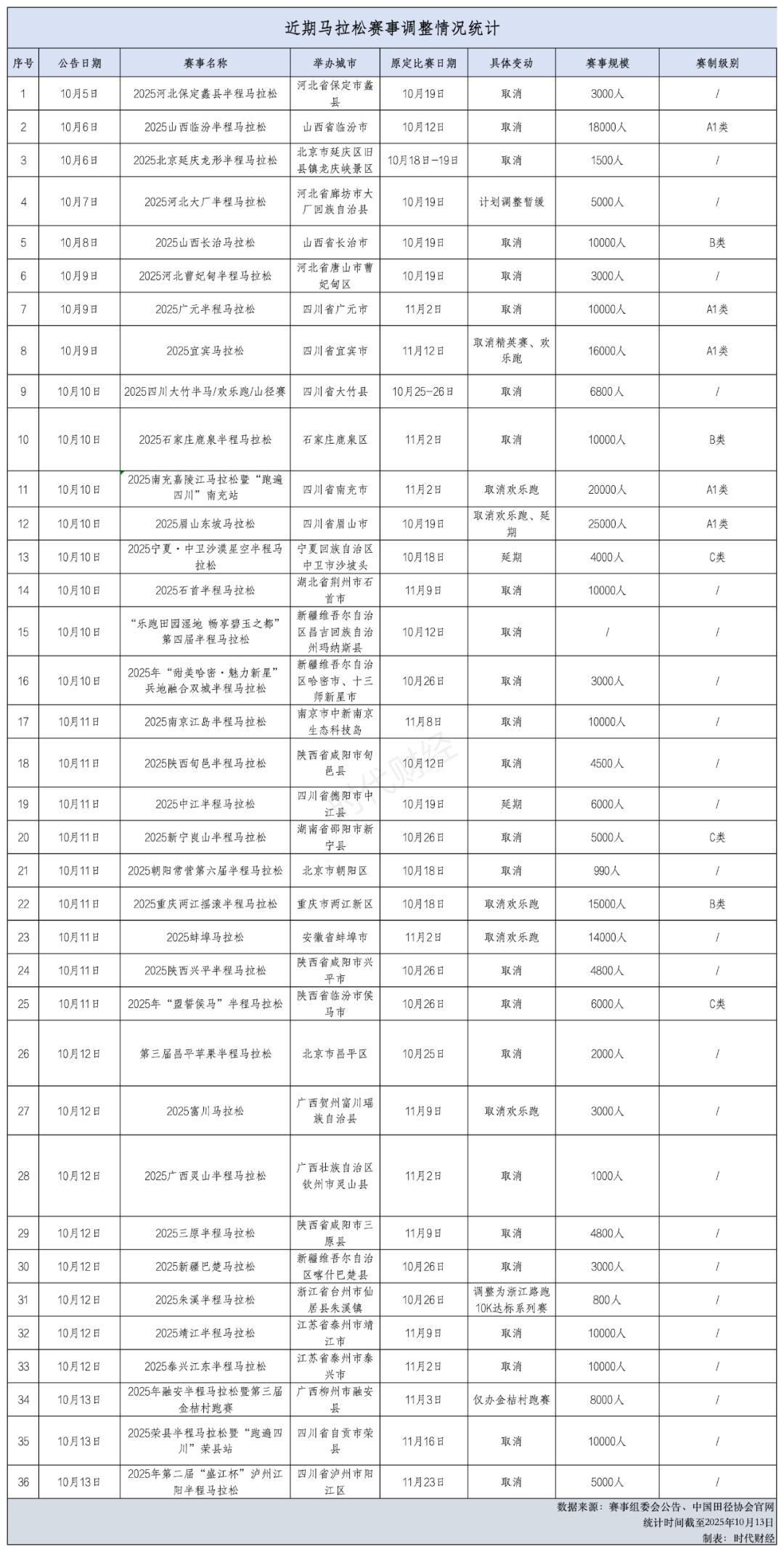 据时代财经不完全统计,10月1日以来,全国各地至少有36场马拉松赛突然官宣取消或调整。其中,以区县举办的马拉松赛事居多,也不乏高规格A1类比赛。