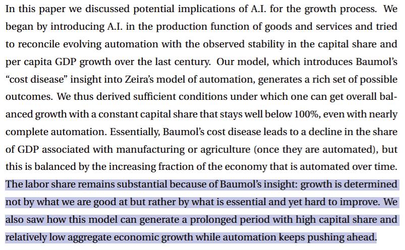 第二个核心观点是:自动化与AI对经济增长的促进作用,可能受「鲍莫尔成本病」理论制约。