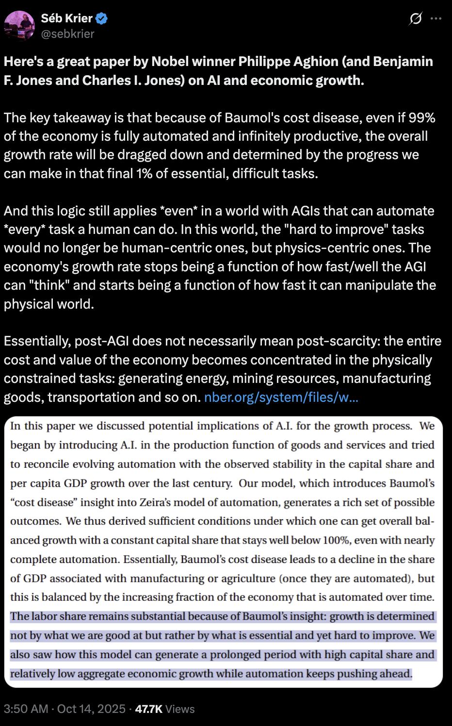 然而,即便如此,鲍莫尔的观点依然适用:即便许多任务实现了自动化,增长仍可能受制于「卡脖子环节」——关键但难以优化。
