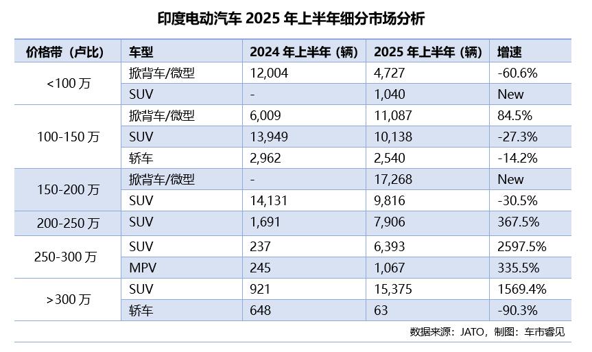 报告指出,2025年上半年印度电动车市场的消费重心从“低价”逐步转向“高续航”和“高性能”。高端SUV市场实现指数级增长。250-300万卢比价格带的SUV产品销量暴涨超过2500%,超过300万卢比的顶级市场,增幅也高达1500%。与之形成鲜明对比的是,150-200万卢比的中端SUV市场出现两位数下滑,而100万卢比以下的微型/小型电动车市场更是急剧收缩超60%。