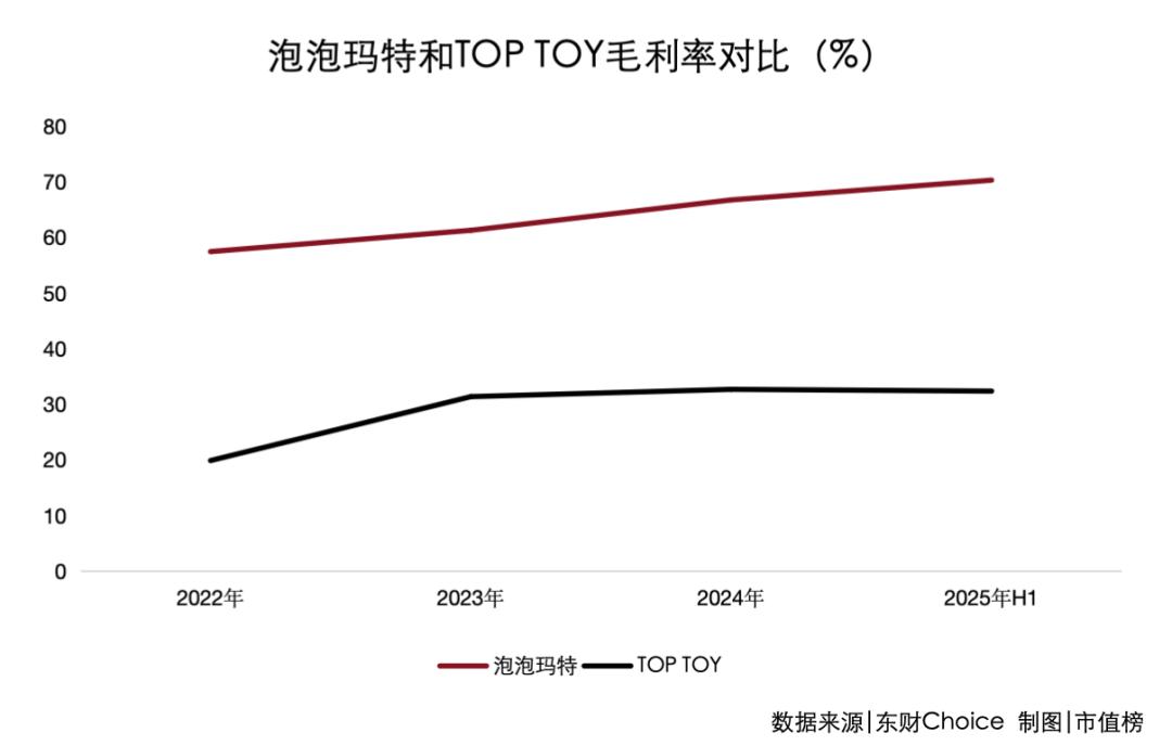 2025年上半年,泡泡玛特的毛利率高达70.3%,远高于TOP TOY的32.4%。