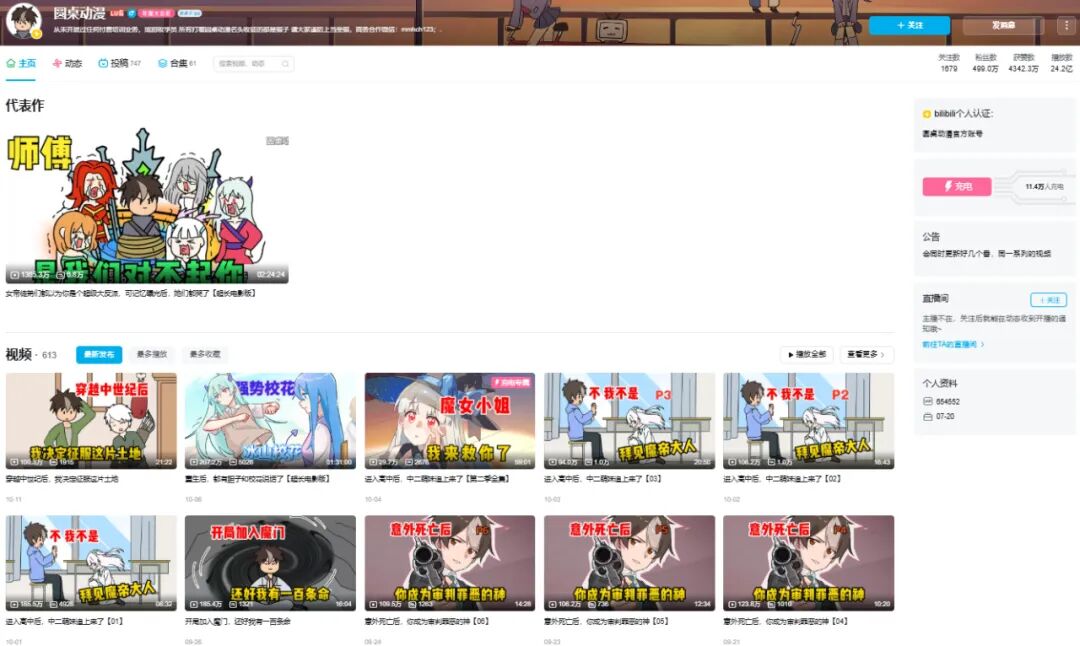 即便是看似粗糙的动画制作,也能凭借深度特色内容吸引用户。比如目前在B站拥有499万粉丝的UP主“圆桌动漫”,日常发布的内容即为网文改编的动画短剧,即便线条式Q版画风简单,甚至有点像PPT,仍获得了众多用户的喜爱。UP主主页显示,当前充电付费人数达11.4万人。按照每月15元的充电金额计算,这项收入已达171万元。而UP主的充电排行榜可见,已有超过100名用户为之充电超过1年时间。