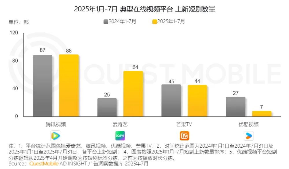 调研机构QuestMobile数据显示,2025年1-7月,腾讯视频、爱奇艺、芒果TV、优酷上新横屏微短剧数量分别为88部、64部、44部、7部;同比2024年1-7月,腾讯视频、芒果TV数量相仿,爱奇艺从25部骤增至64部,优酷则从27部降至7部。也就是说,自2024年至今,除优酷上新30余部外,腾讯视频、芒果TV、爱奇艺的微短剧数量都在百部级别。