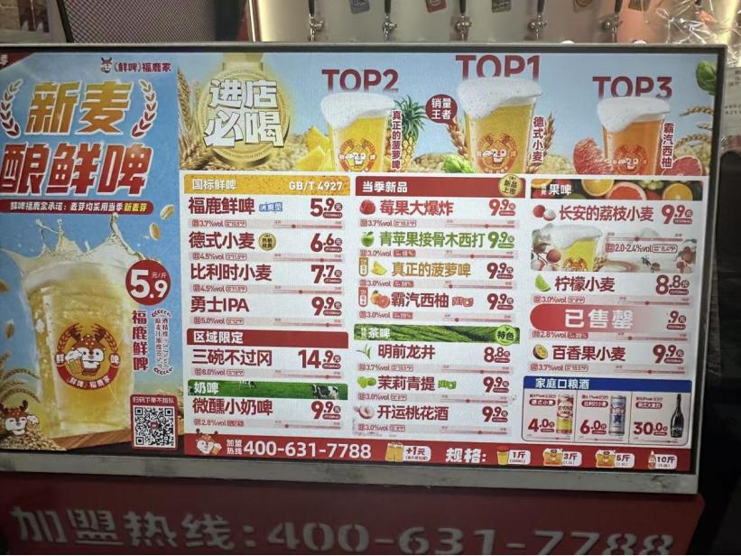 2021年7月,主打精酿啤酒的福鹿家啤酒厂(鲜啤福鹿家前身)在郑州正弘城开出首店后,就开始通过单店加盟的形式布局区域市场。在产能完善后,又进一步通过免加盟费、降低原料进货价、减免配送费等举措吸引加盟商关注,以此实现快速扩张。上述门店店主就向红餐网表示,加盟该店总投资约20万元。